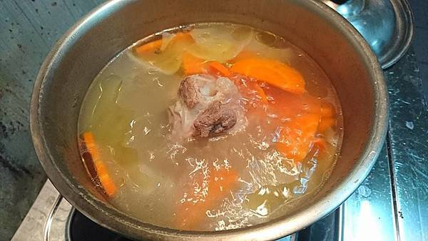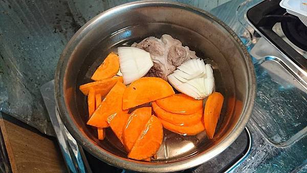 我先去買回豬大骨,加上洋蔥跟紅蘿蔔先熬煮高湯。